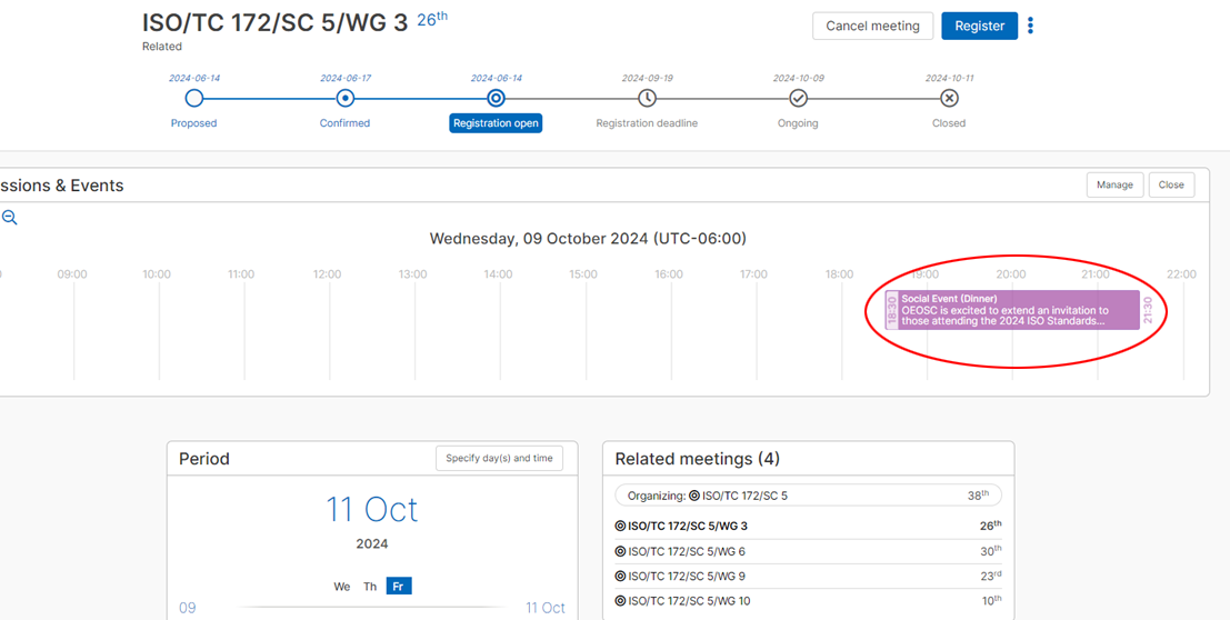 - Sign-up for the social event is available once you are registered for one of the WG meetings. If you click on one of the meetings, you will see the social event sign-up under “Sessions & Events”? The social event registration should pop up when clicking on the pink timeline.